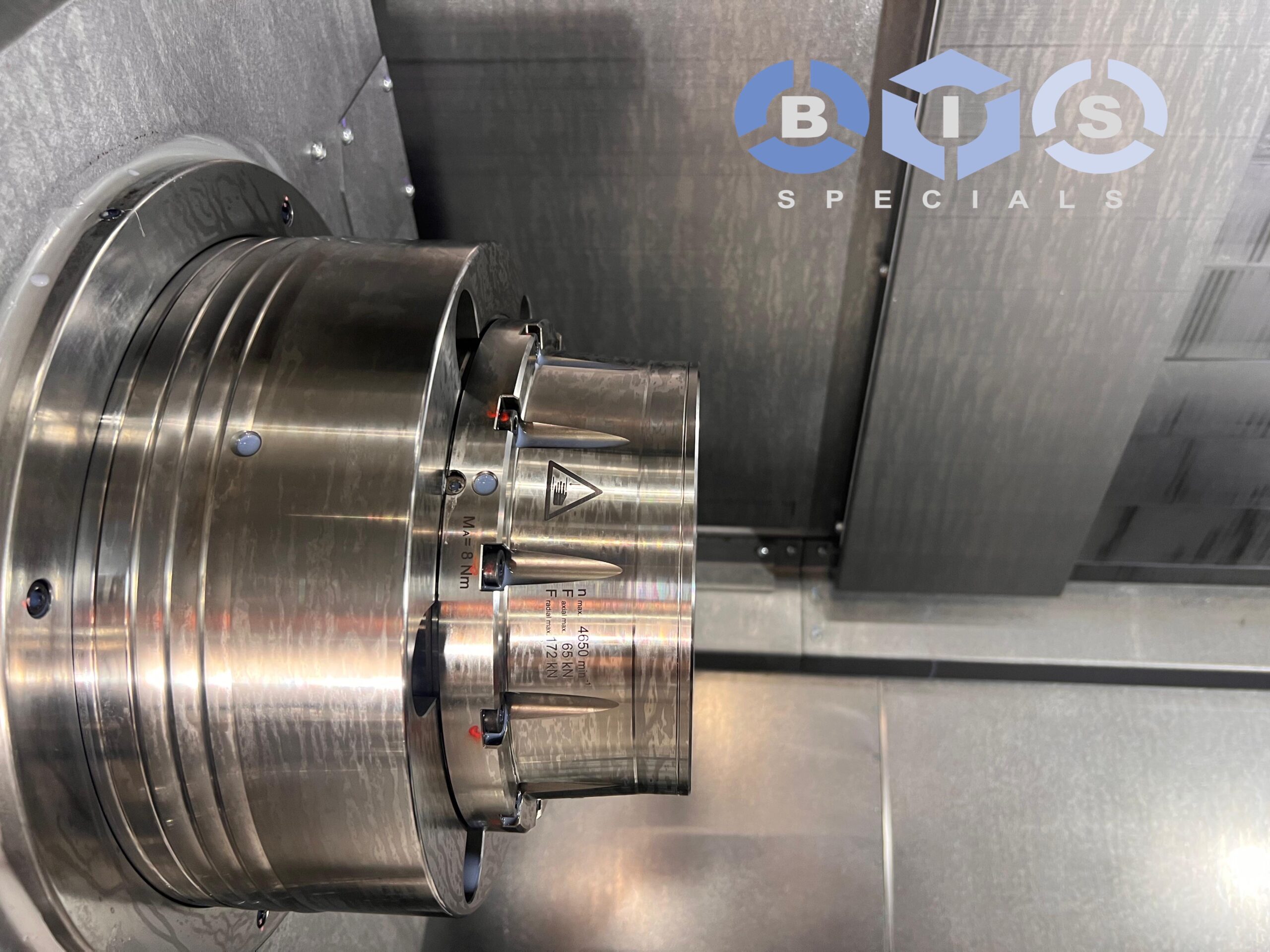 Op deze MAZAK IntegreX i250 HS is de standaard KITAGAWA klauwplaat van de hoofdspil vervangen voor een HAINBUCH TOPlus 100 mini Axzug spantang systeem.
